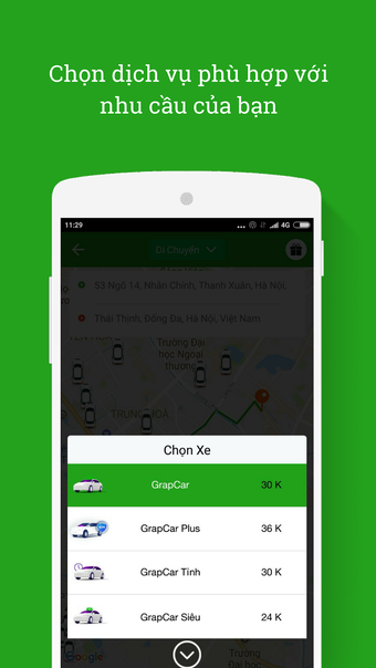 Choose your pickup point and the service you want to use: private cars, buses, Grap public transport, private vehicles or other Grap services. You can also choose Grap services you want.